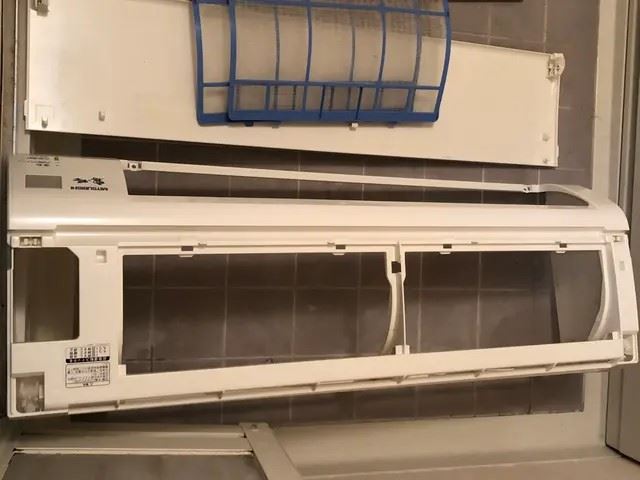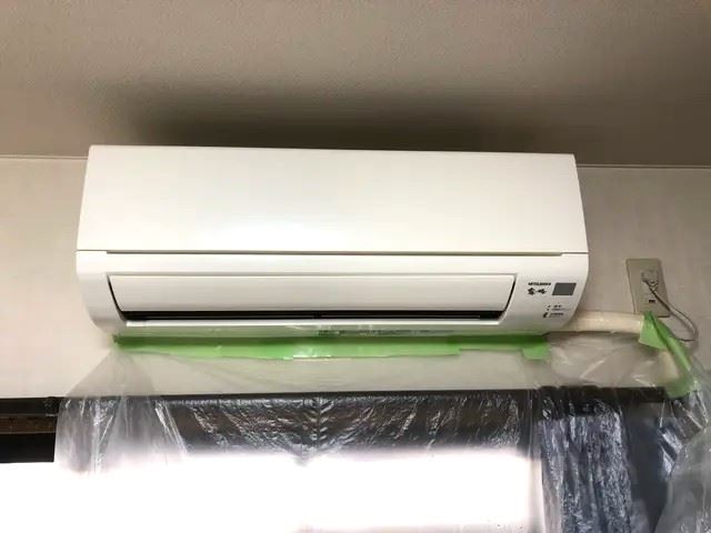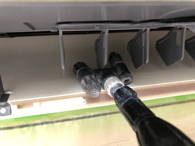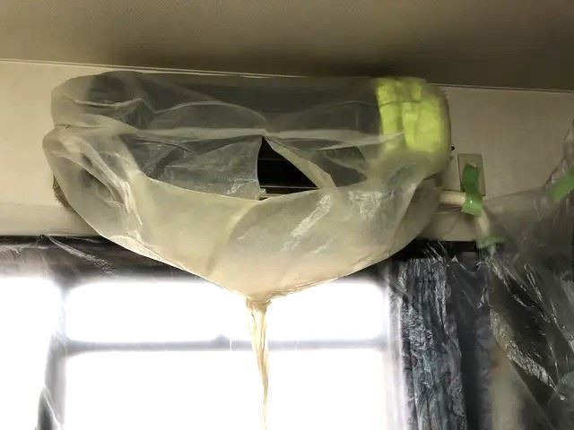 エアコン周りの水養生を行いまして、エアコンのカバーを外し、本体のアルミフィンとファンを洗浄致します。